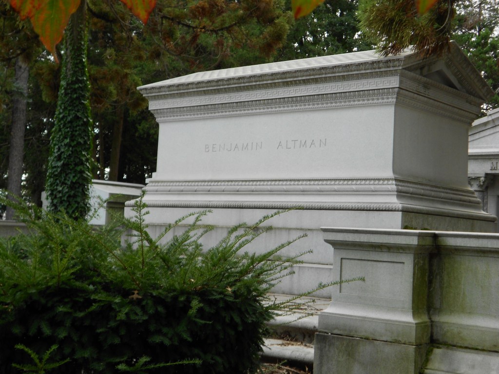 When Benjamin Altman, the store’s founder, died in 1913, thousands lined the streets to witness his funeral procession. Two years later, Altman’s granite tomb was dedicated in a ceremony attended by B. Altman employees. Designed by the New York architectural firm of Trowbridge and Livingston, which also designed Altman’s flagship store, the monument is ornamented by a Greek key motif and rests upon a platform at the center of an oval space, surrounded by mausoleums and flanked by pine trees. In 1985, Altman’s flagship store was designated a New York City landmark. The building now houses a branch of the New York Public Library.